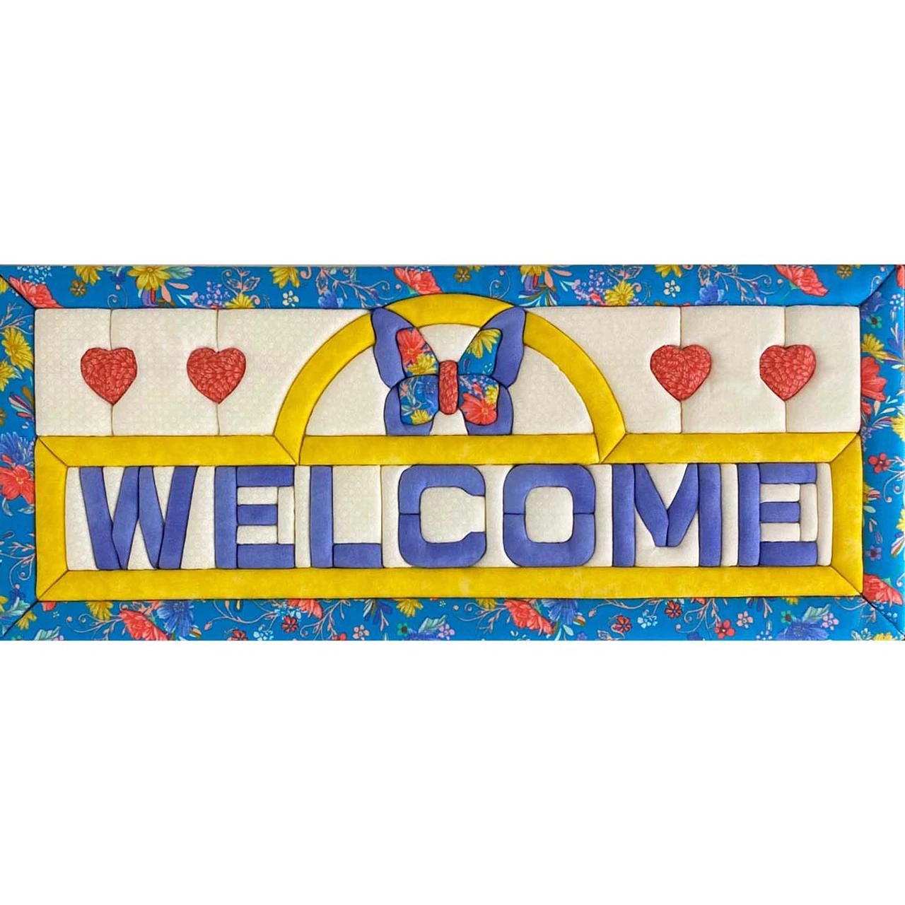 • No-sew quilted wall art features the word “Welcome” framed by yellow and accented with a blue butterfly and four red hearts.