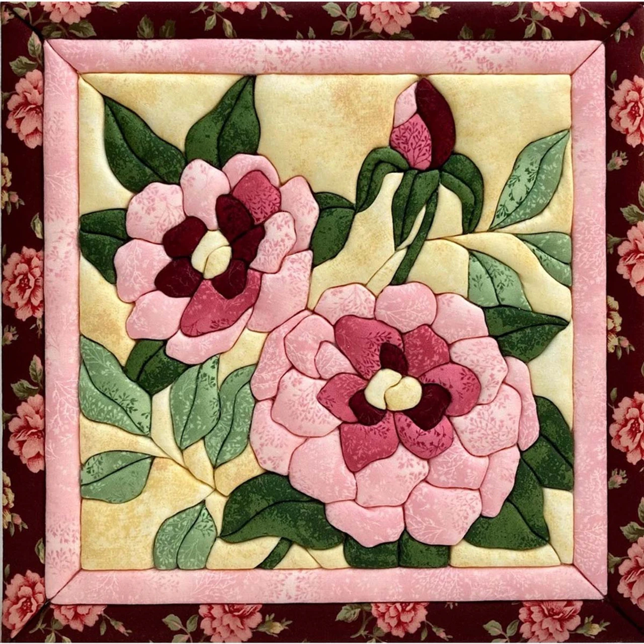 • No-sew quilted wall art features two pink blossoms with an opening flower bud.