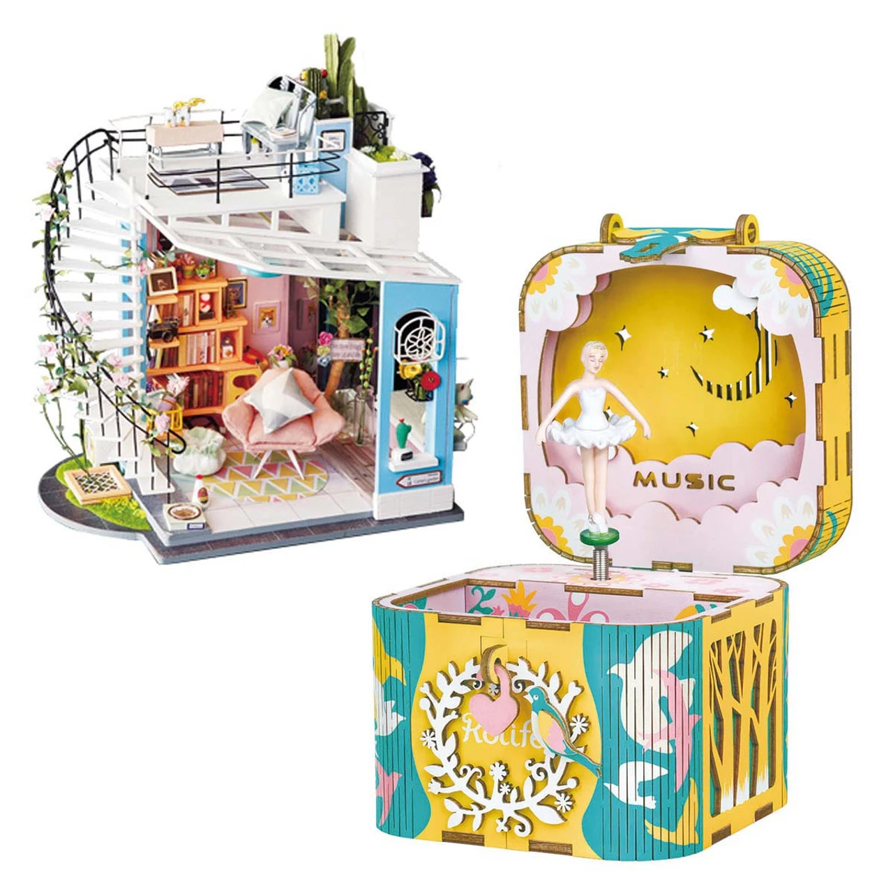 Build a magical little world filled with delightful details as you assemble these charming wooden models. Find a retreat in Dora’s Loft, filled with cozy furnishings and homey details. Or, dream of being the prima ballerina as you twirl to a classic tune played by this lovely music box. Each kit includes pre-assembled items made from wood, paper, fabric, and metal, some tools, and easy instructions. Music box includes music movement to play the song Greensleeves. Dora’s Loft requires two lithium button cell batteries (not included). These projects are intended for ages 14+.