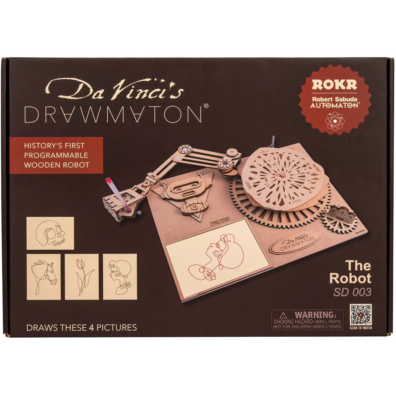 As you crank the handle steadily, The Robot draws a single line picture! Put any drawing utensil into the Robot’s hand, place a piece of paper into the draw area, and slowly turn the small gear knob.