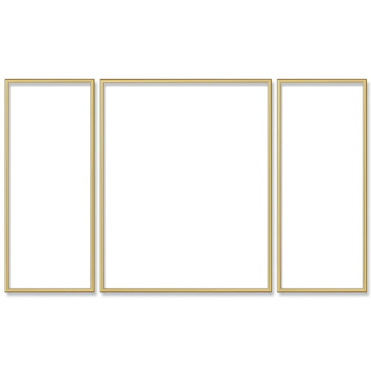 Create a triptych art display with coordinating gold-colored aluminum frame. This set of three matching gold frames contains one 15¾ x 19½” (40 x 50cm) frame and two 8 x 19½” (20 x 50cm) frames. Displayed together, the complete set measures approximately 31½ x 19¾” (80 x 50cm). These frames are perfect for triptych-style paint-by-numbers but can also be used to create a gallery wall of needlework, paintings, or other artwork. The easy-to-assemble sectional frame set includes gold-colored picture moldings, corner connectors, springs, hooks, screws, and easy-to-follow instructions to crate three frames. Each adonized aluminum frame has a golden shimmer that highlights your artwork and a narrow outline that makes sure your artwork is the star of the show.