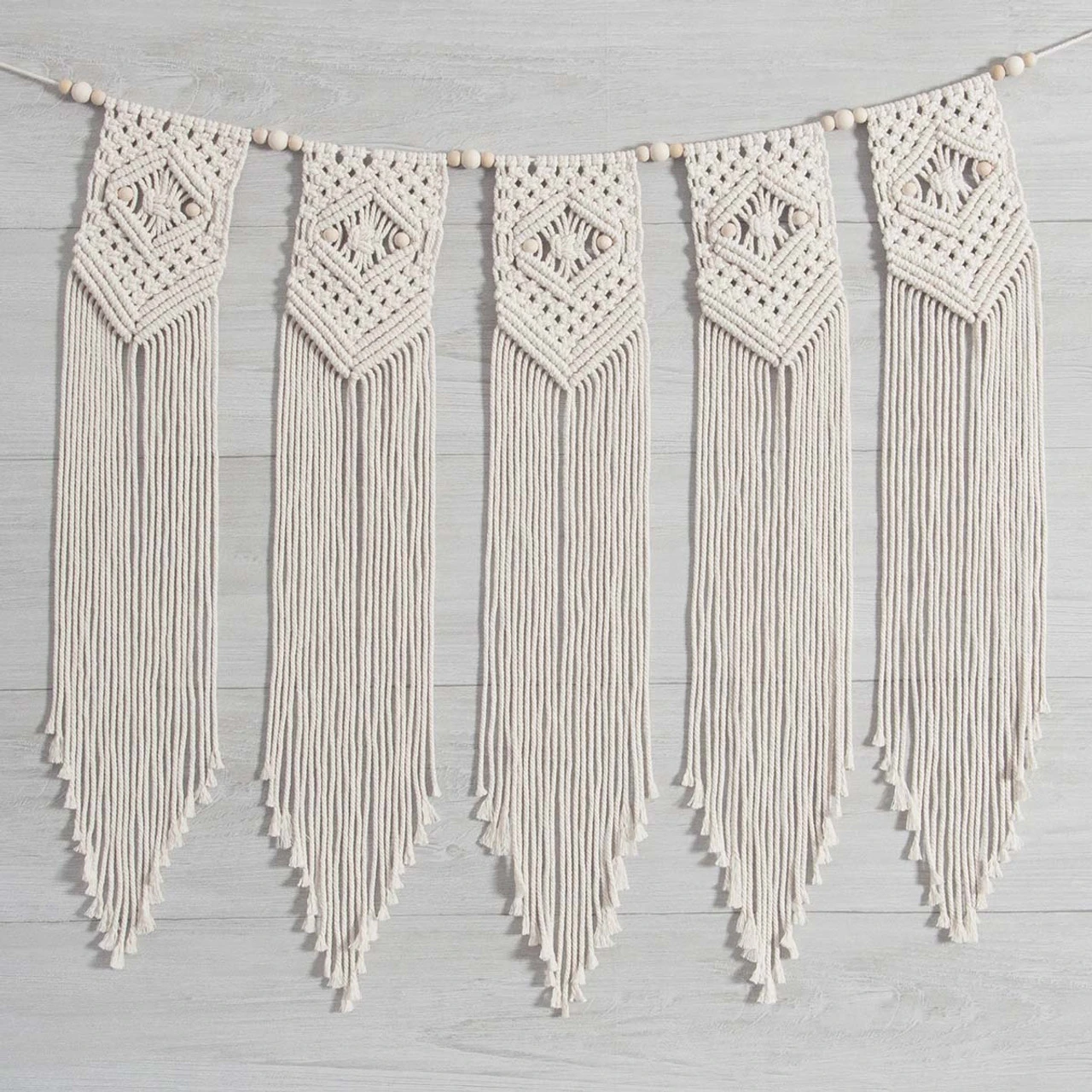• This wall hanging design features five long macramé wall hangings combined into a garland-style display.