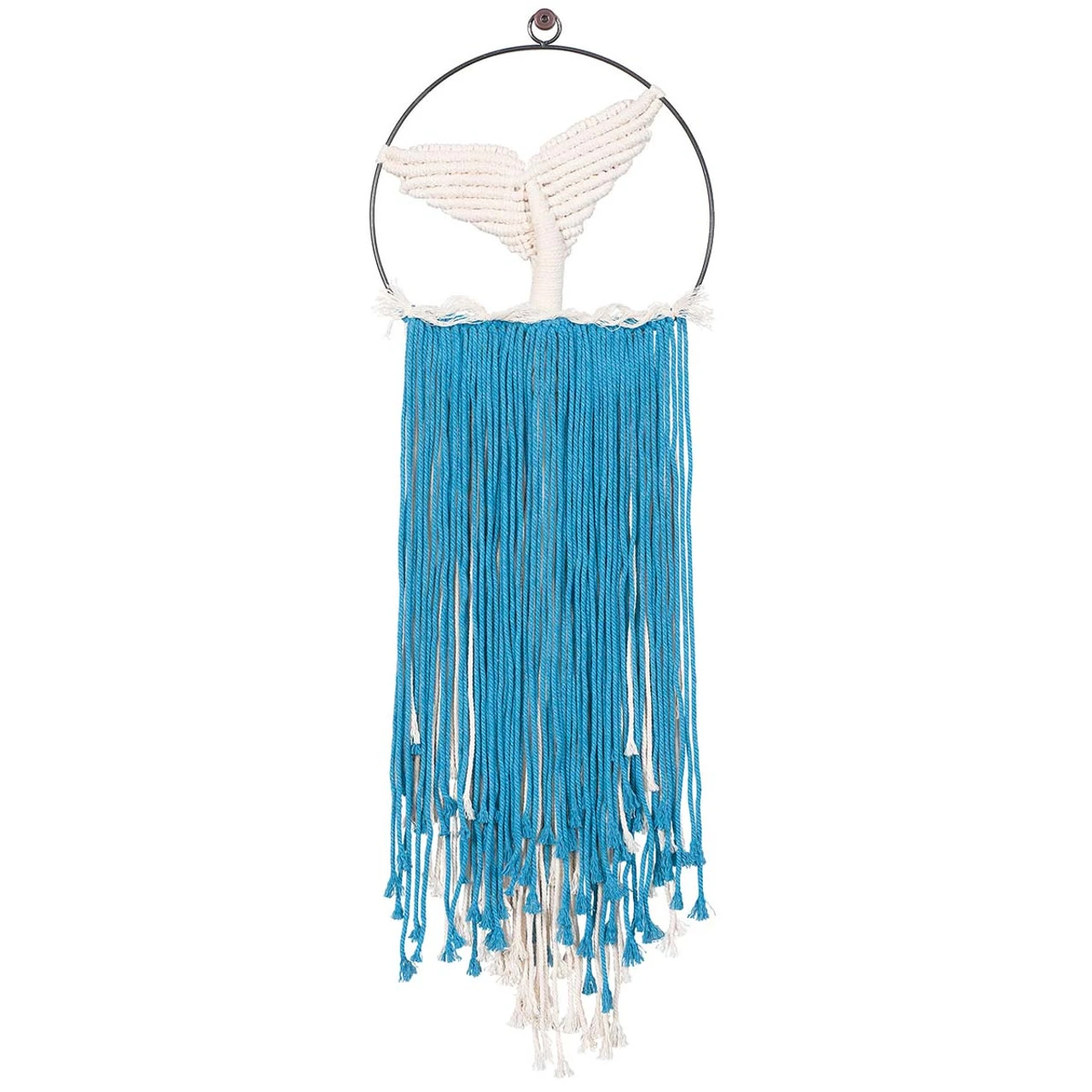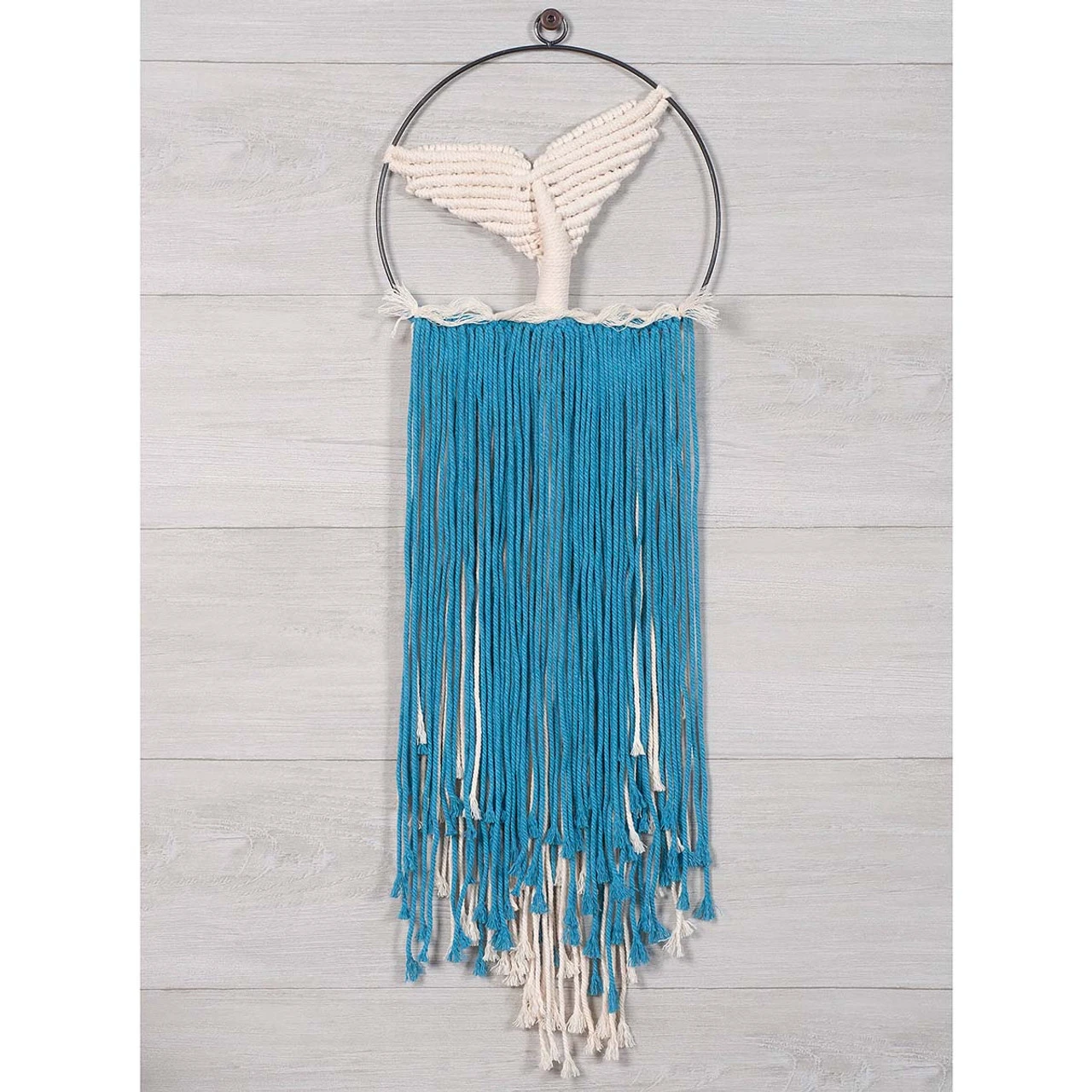 • This wall hanging design features a knotted whale tail sticking up out of ocean waves created by a cascade of blue and ecru fringe.