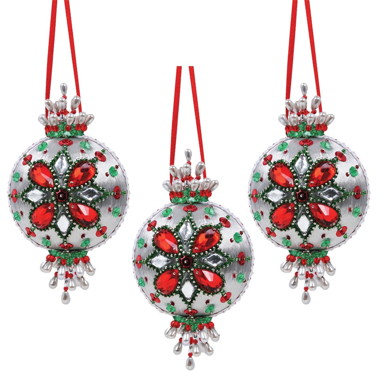 This sequin and beaded ornament design features a poinsettia-inspired display of red and crystal acrylic jewels surrounded by red and green sequins and beads on a silver ornament form. Inspired by traditional holiday baubles, these elegant sequin and beaded designs are miniature masterpieces to showcase on your tree. The sequins and beads will catch the lights of your Christmas tree, adding an extra bit of sparkle to your décor.