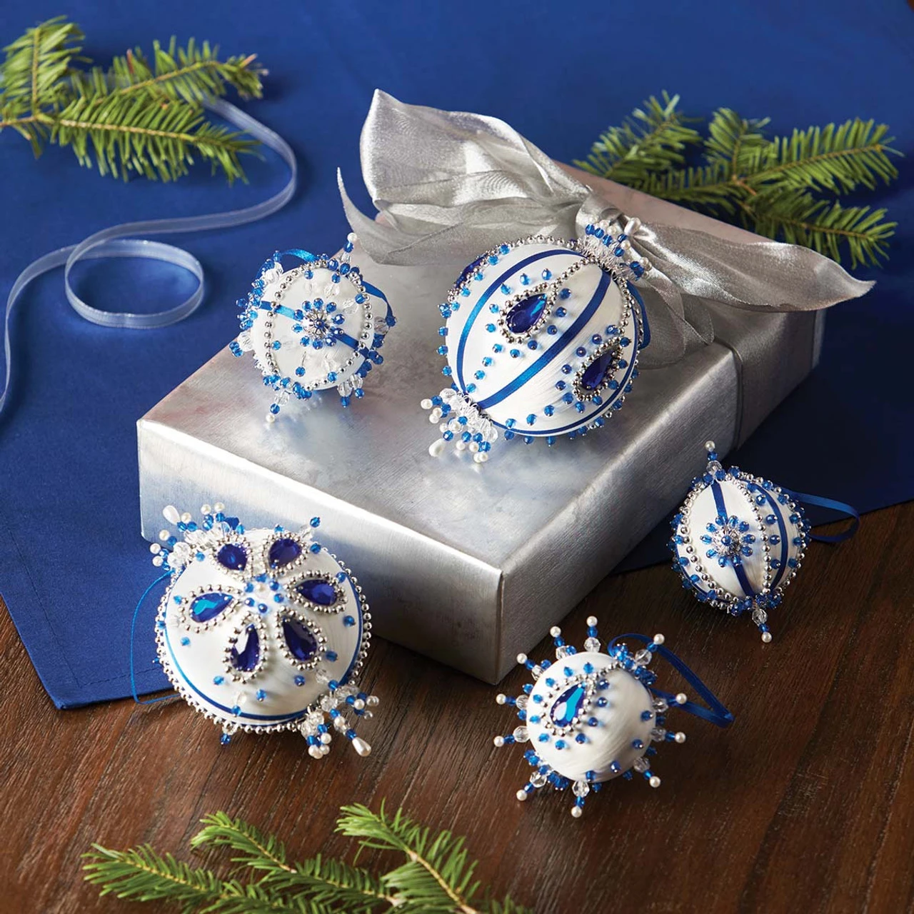 • This sequin and beaded ornament kit includes satin-wrapped ornament forms, sequins, beads, beading needle, pins, embellishments shown, and instructions.