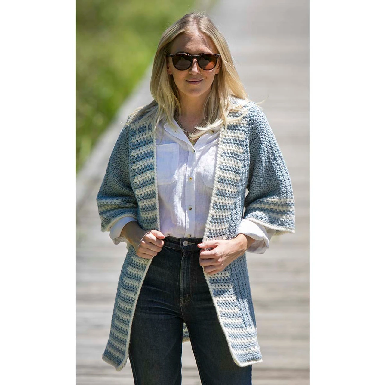 Striped detailing from Mary Beth Temple adds visual appeal to this open front cardigan crocheted with Willow Daily Worsted yarn. Kit includes Willow Daily Worsted yarn and intermediate crochet instructions. Imported.