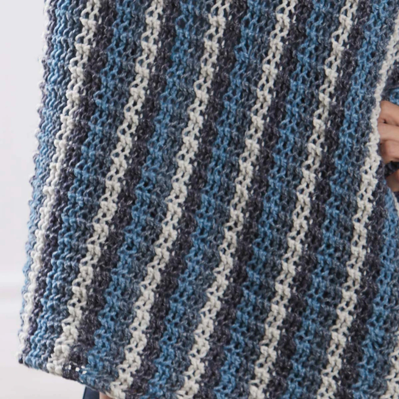 Vertical stripes of tone-on-tone denim create a complex look and texture to elevate denim to evening wear. Kit includes Willow Denim Grace yarn and easy knit instructions. 23 x 28″ (58 x 71cm). Imported.